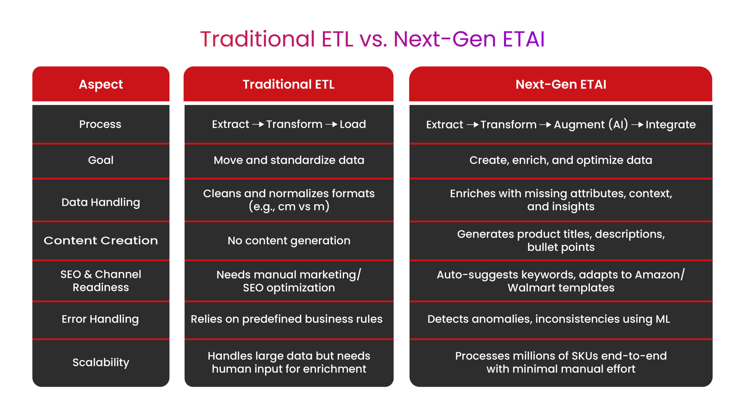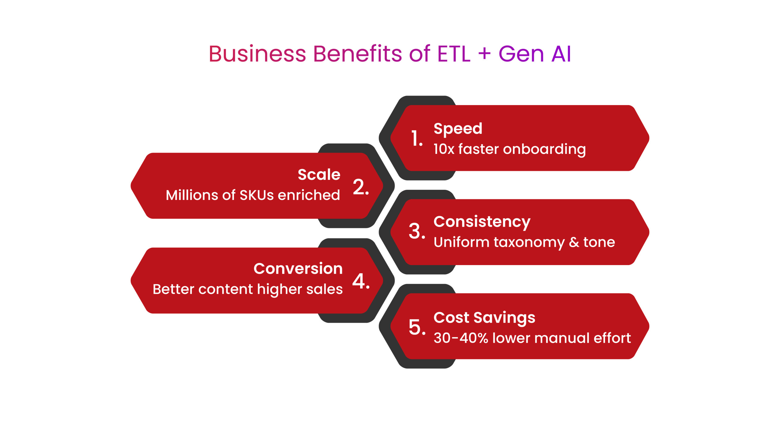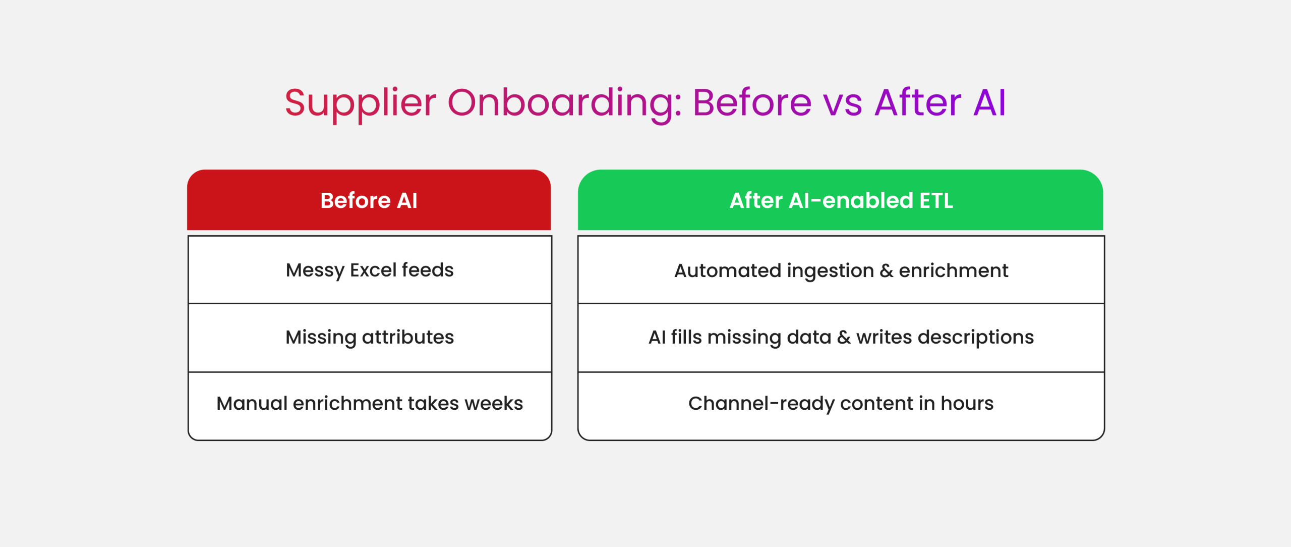 - Now: AI-enhanced ETL ingests, enriches, and generates missing details, producing ready-to-publish SKUs in hours.